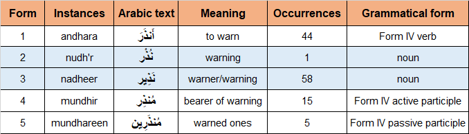 There are 58 instances of nadheer (نَذِير) in the noun form in the Quran meaning “warner/warning” found in 54 verses in the Quran. Out of 58 instances, 36 instances in 33 verses of 19 surahs are detailed below to better understand its meaning in different contexts, while an Arabic word may have a range of meanings in different contexts: