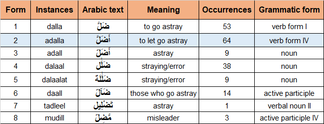 191 instances of dalla including its derived forms in the Quran as shown in the table below are reviewed to better understand their meaning in different contexts that upon reviewing the messages in different contexts may help us to confirm whether we are in astray or we are the guided ones: