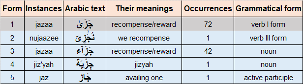 There are 117 instances of jazaa and its derived forms in the Quran as shown in the table below are reviewed to better understand their meaning in different contexts: