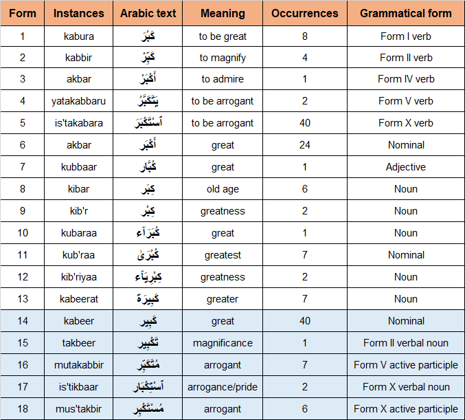 There are 40 instances of kabeer (كَبِير) in the nominal: noun and adjective form in the Quran literally meaning “great”, found in 40 verses of 22 surahs in the Quran to better understand its meaning knowing that an Arabic word may have different meanings in different contexts to reflect the appropriate message: