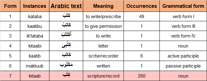 53 instances of kitaabun found in 46 verses of 7 surahs are detailed below to better understand the messages in these verses of the Quran followed by review of 58 instances in 46 verses of 2 surahs: