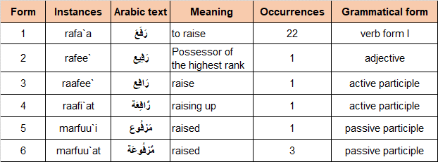 There are 29 instances of rafa`a and its derided forms in the Quran, as shown in the table below according to their grammatical forms, which are reviewed to better understand their meanings in the different contexts: