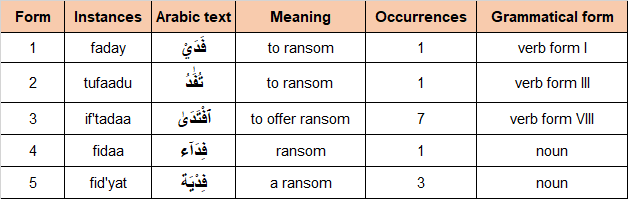 Reviewing 13 instances of faday and its derived forms confirms the important message about the painful punishment of the disbelievers on a day of the Judgment, even offering of any ransom would not be accepted from them and their abode is Hell, which is a miserable destination for the disbelievers and the criminals, but a ransom of fasting or charity or sacrifice is acceptable to God when a pilgrim cannot not find an animal for offering, while fasting of three days during the Hajj and seven days when he has returned home.
