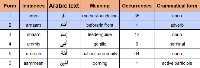 Reviewed 36 instances found in 32 verses of 23 surahs in the Quran. Instances of umma can be reviewed reflecting meaning foundation in the context of the Quran having the clarified verses, which are foundation of the scripture, and meaning mother in the contexts of mother’s share in the inheritance law, mother, mother-in-law and a woman who has nursed are forbidden in marriage, mother of the cities and mother of the scripture, Mary being mother of Jesus as well as Jesus and his mother being a sign, mother of Moses to whom he was returned, mother of Aaron to be blamed for causing division between the Children of Israel in absence of Moses, raising a messenger in mother cities to recite God’s revelations, mother as care taker of her child, estranging wives as mothers, prophet’s wives are like mothers of the believers, fetuses in the wombs of mothers, and meaning abode to be in lowest, and the instance of amaan meaning in front about thinking of the gathering of the human being in front is a lie.