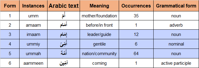 There are 64 instances of ummah meaning community/nation in the noun form in the Quran, 25 instances found in 24 verses are detailed below to understand their meanings in different contexts: