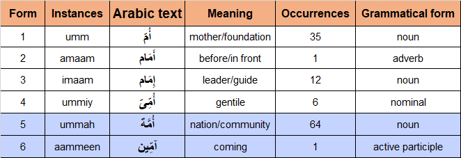 Reviewed 39 instances of ummah in 33 verses of 18 surahs and 1 instance of aammeen in 1 verse of 1 surah in the Quran. Messages from Instances of ummah confirm the punishment as specified is not delayed, while no community can advance its term nor can it delay, if God wills, He could make the people one community, while He has raised messenger from every community to recite His revelations and has made a rite to be observant of it, He has sent His messengers in succession to every community, while they have denied him, He will raise a witness from every community when they know the truth from God that they had gone astray for what they had invented, while there is no community had passed except a warner in it with the truth as a bearer of good news and warners, there are communities who had sworn by God that if He had sent messenger, they would be better guided but when had a messenger they denied him, He has assigned companions that have made fair seeming for them what was before of them and what was behind of them to justify the punishment in the communities from the humans and the jinns, He has mentioned an example of a people of Noah and parties after of them that every community has plotted against their messengers to seize them and has disputed with the falsehood to refute the truth with it had been punished, and from instance of aammeen is to help each other in uprightness and righteousness but not in sin and transgression.
