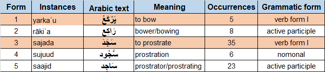 Out of 13 instances of yarka`u and its derived forms, 5 instances of yarka`u meaning ‘to bow’ in the verb form I, and out of 64 instances of sajada and its derived forms, 35 instances of sajada meaning ‘to prostrate’ in the verb form I in the Quran, are reviewed below to better understand their meanings in different contexts: