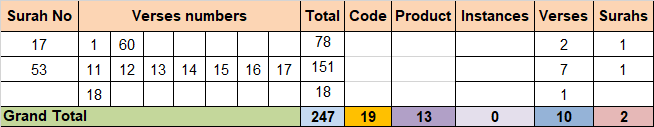 The event has been precisely described in 10 verses of 2 surahs in the Quran, and if the relevant verse and surah numbers are added, the total is a multiple of 19 => 247 (19X13) as shown in the table below: