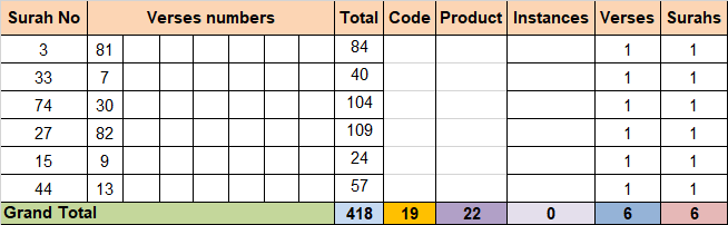 The fulfillment of the advent of a messenger of the covenant event has been precisely described in 6 verses of 6 surahs in the Quran, and if the relevant verse and surah numbers are added, the total is a multiple of 19 => 418 (19X22) as shown in the table below: