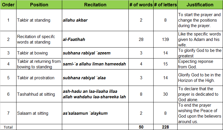 Note: The recitation at 7 positions, and the number of words and letters that we recite if these figures are added, i.e., 7 + 50 + 228, the total of 285, is a multiple of 19 => 285 (19X15) being it a fact not to have any doubt to establish the salat prayer with appropriate recitation in each position.